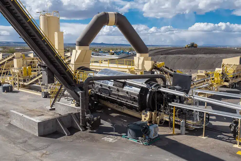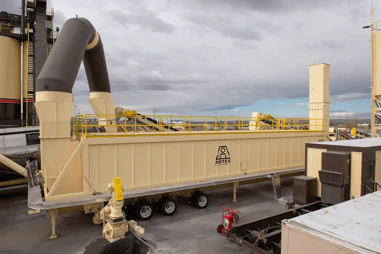 Albuquerque Asphalt’s new plant is an Astec Portable 400 TPH 8-foot by 38-foot Double Barrel Drum Mixer equipped with an Astec Warm Mix System. Other components include a portable 10-foot by 14-foot five-bin cold-feed system, a portable 10-foot by 14-foot dual-bin recycle-feed system, a portable 69,685 CFM Express Baghouse with Inertial Dust Separator, two 200-ton 14-foot diameter New Generation Storage Silos, a Blue Smoke Package for the top of the silos, an 11-foot by 80-foot Low Profile Truck Scale with Weigh Mate 2000 Truck Loadout and Management System, an Observer Control Center and Power Center, a CEI 35,000-gallon portable asphalt tank with HC-120 heater, a CEI 30,000-gallon portable asphalt tank and a CEI 1,000 GPH heavy-duty preheater.