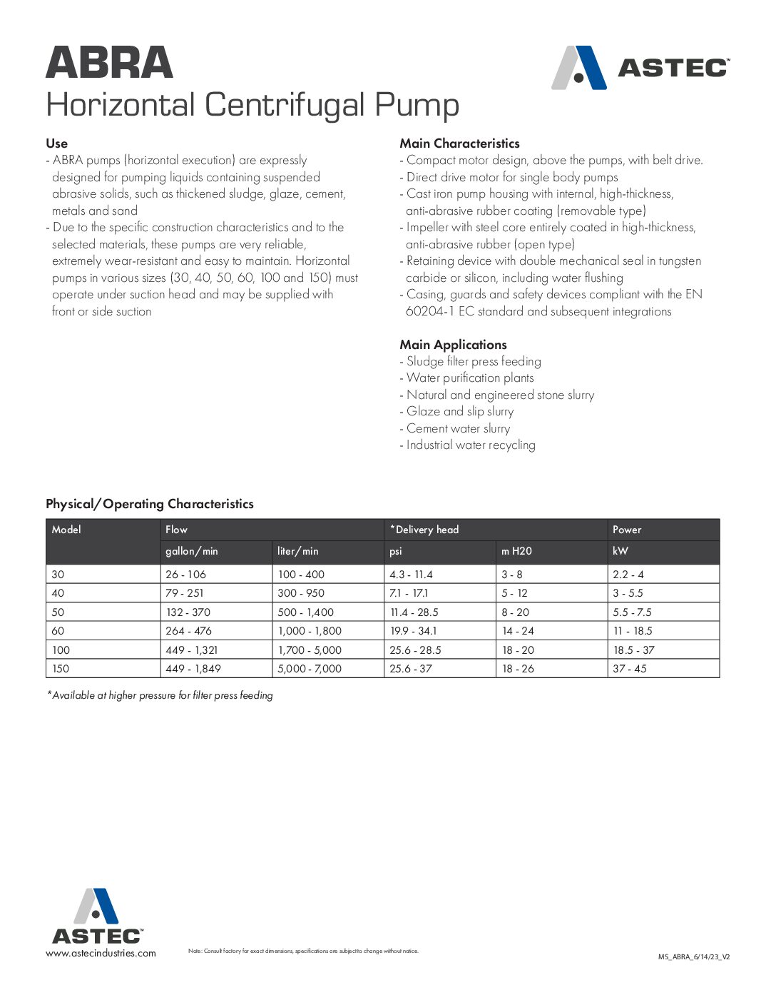 ABRA Horizontal Centrifugal Pump Spec Sheet English