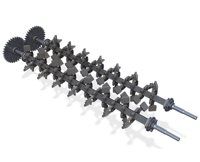 The v-shaped notch allows material to start pouring out of the bucket at the beginning of each revolution. The material in the bucket continues to pour out until the rotation is complete. This is what provides an even veil of material. The v-flight is also larger than a traditional flight, allowing it to carry the same amount of aggregate even with the notch.