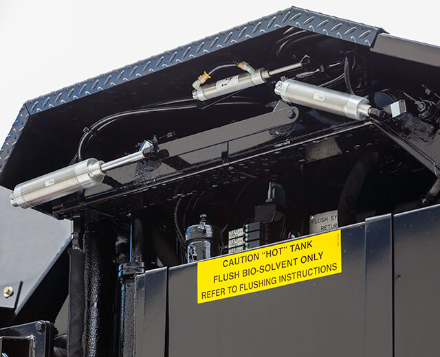 Combining spraying and laydown produces a high-quality mat with a strong bond between layers. A spray bar just in front of the paver’s auger distributes the liquid through computer-controlled, self-cleaning valves. An onboard microprocessor precisely controls the rate of flow. Valves can also be controlled manually and are arranged in sets of three, providing plenty of spray capacity so you can move fast. To cut down on refill stops, the SP-200 is equipped with a 2,100-gallon tack tank, the largest tank available on the market today.