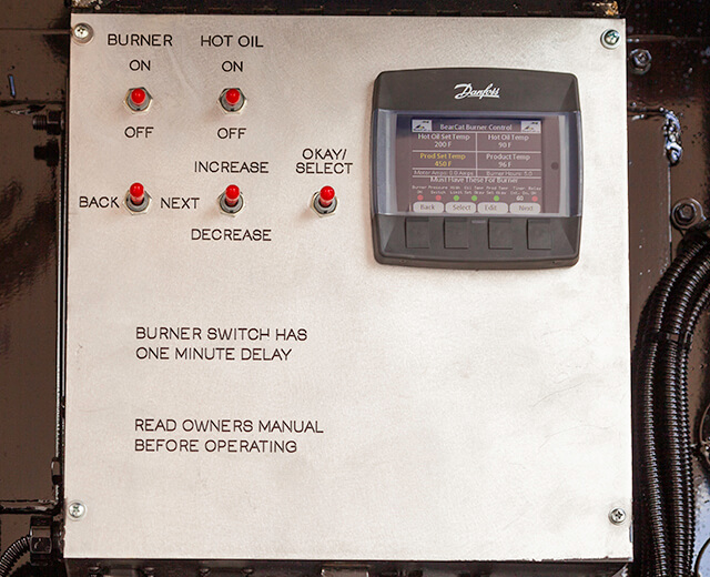 Oil is heated by a 500,000 btu diesel-fired helical coil heater. The system can operate at temperatures up to 450ºF for liquid AC.