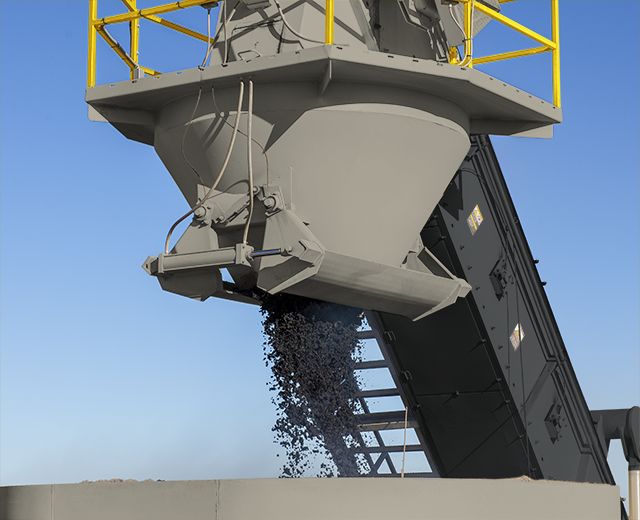A four-ton (3.6 metric ton) batcher is installed at the top end of the Astec SEB's drag conveyor. It collects the mix discharged from the drag conveyor. Segregation is minimized by dropping full batcher loads into the surge bin.