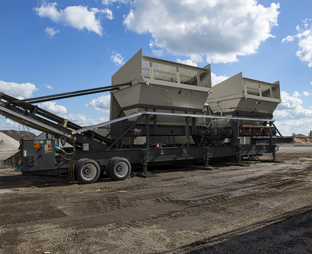 Pull the cold feed into position at the site. Lower the thick tubular steel foundations into place to support the portable cold feed unit. All belt feeders and the collecting conveyor are included. The inclined end of the collecting conveyor discharges onto a transfer conveyor feeding screen. Built-in, hinged bulkheads swing into operating position in minutes. Pre-installed, optional bin partitions and grizzlies fold down for transport.