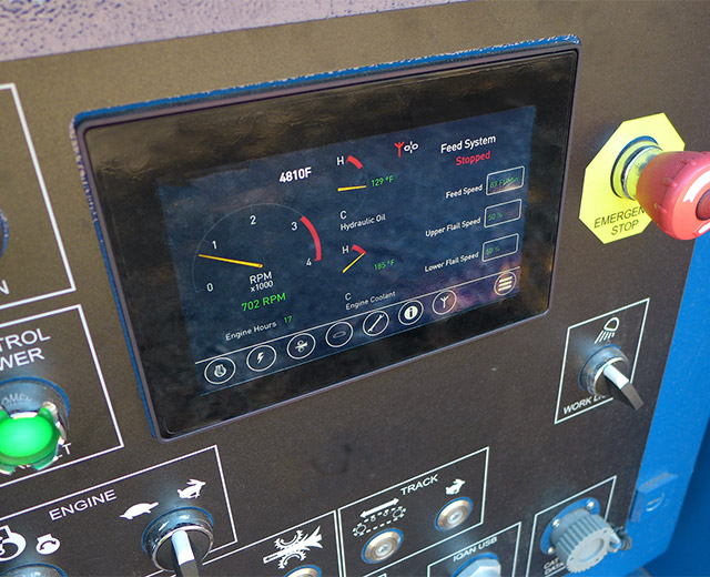 The 4810F Chain Flail Debarker is powered by a Tier III or Tier IV 350 HP (261 kW) CAT C9 engine, and meets all US, Canadian, and European Union emission regulations. With a dedicated 135 gallon (511 l) hydraulic oil tank, and a 175 gallon (662 l) fuel tank, it is capable of running an entire shift without fill-up.