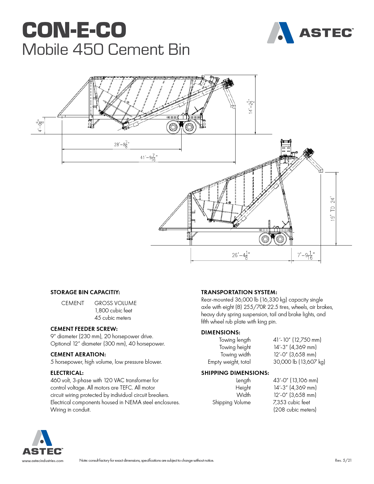The bin is a single-compartment enclosure with a nominal cement storage capacity of 600 Barrels | 112 Tons | 2,400 Cubic Feet. The unit is a trailerized, main frame with a triple axle spring suspension transportation gear featuring a kingpin, brakes, and signal lighting. The bin features one 5” fill pipe with the option to add three additional fill pipes. The unit is pre-plumbed, pre-wired, and features an access hatch for ease of maintenance. The cement screw is a 12” direct drive screw, powered by a 40 HP motor. The bin features a NEMA motor control panel with one high-level and one low-level indicator with a lightbox. The hydraulic system operates on a gasoline-powered 3.5 HP hydraulic pack that includes two main lifting cylinders and four frame lifting cylinders for running gear removal.