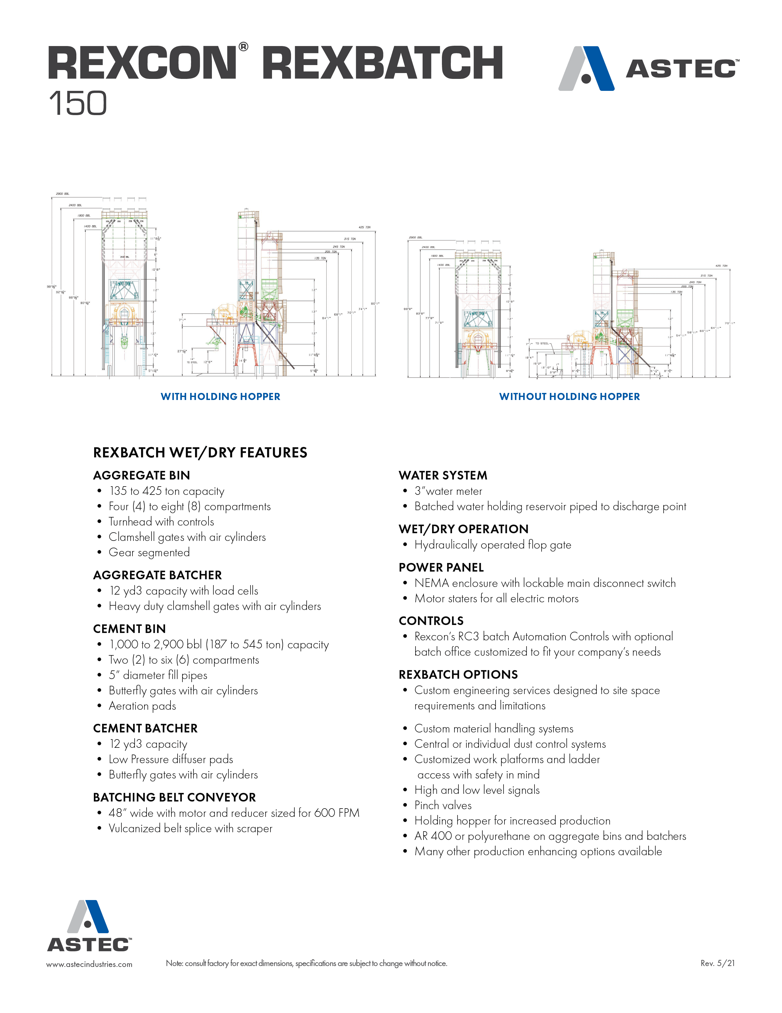 RexCon’s Custom Batch Plants are engineered for flexibility and offer multiple configurations for any ready mix operation. The entire plant comes pre-assembled in modular sections for simple, quick erection. From the conventional style RexBatch 150 with low profile aggregate bins and round silos, to a Custom RexBatch 150 with multiple truck lanes and high capacity, gravity feed L-bins, you determine the style and size of your custom batch plant.